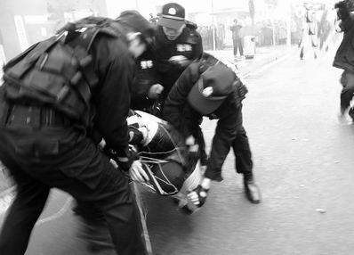 21日下午,郑州警方在紫荆山路与东大街交叉口的工行东大街分理处举行了一次多警种反抢劫演习。交巡警、防暴警、空警等各路民警相互配合,经过5分半钟的激战,3名持枪“劫匪”中,两名被击毙,一名被生擒。