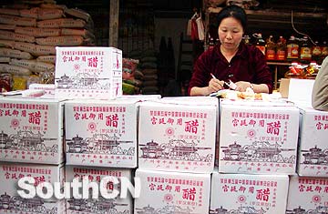 在东兴南路的食品批发市场,数名男子正忙着往摩托车上装成箱成箱的米醋。一家店铺的老板告诉记者,现在到厂家已经拿不到货了,他现在是在“炒醋”。老板说,他当天早上卖出的米醋是平价40多元一箱,但后来发现来进货的人越来越多,他又从其他地方以80元一箱的价格买进,再以100元的价格卖出。至于卖出多少箱,这位赚钱赚到笑的老板称“已经数不清了”。