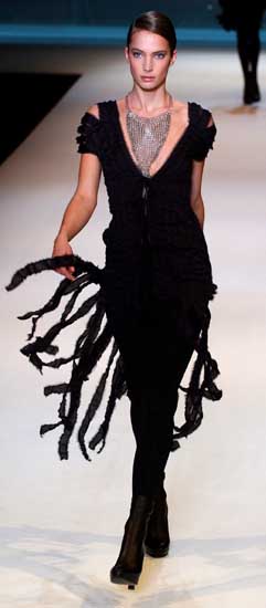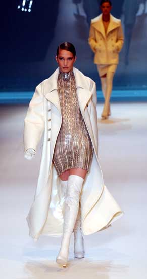 3月9日,在巴黎举行的2003-04年度高级成衣时装展览会继续。据悉,该时装展为期一周,图为模特在展示西班牙设计师Rosemary Rodriguez的作品。