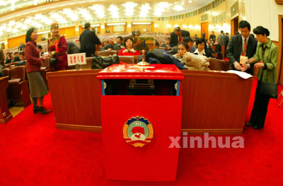 3月13日下午15:00,政协十届一次会议将在北京人民大会堂举行第四次全体会议,选举产生政协第十届全国委员会主席、副主席、秘书长和常务委员。这是大会选举使用的具有自动统计功能的票箱。