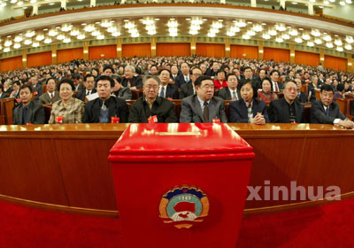 3月13日,全国政协十届一次会议在北京人民大会堂举行第四次全体会议,选举产生政协第十届全国委员会主席、副主席、秘书长和常务委员。这是大会会场。