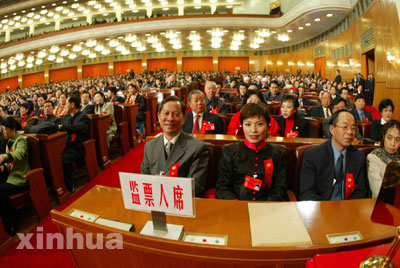 3月13日,全国政协十届一次会议在北京人民大会堂举行第四次全体会议,选举产生政协第十届全国委员会主席、副主席、秘书长和常务委员。这是监票人席。