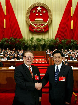 3月15日,十届全国人大一次会议在北京人民大会堂举行第五次全体会议。江泽民当选中华人民共和国中央军事委员会主席。胡锦涛当选中华人民共和国主席。这是江泽民和胡锦涛亲切握手。