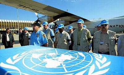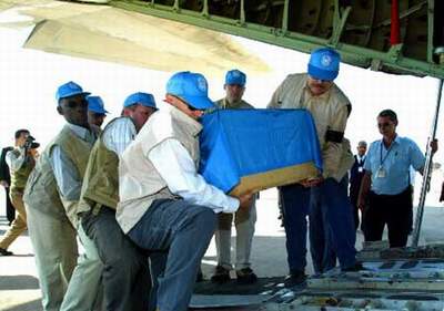 | 3月16日,在伊拉克首都巴格达的萨达姆国际机场,一些联合国武器核查人员将他们的同事、中国专家郁建兴的棺木抬上飞机。 |