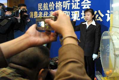10日上午,中国消费者协会在长安公证处和新闻媒体的监督下,公开摇出了7名参加民航票价听证会的消费者代表名单。北京市惟一一名代表是首都机场工商分局局长任穗英,同时,他也代表全国公务员参加这次听证会。