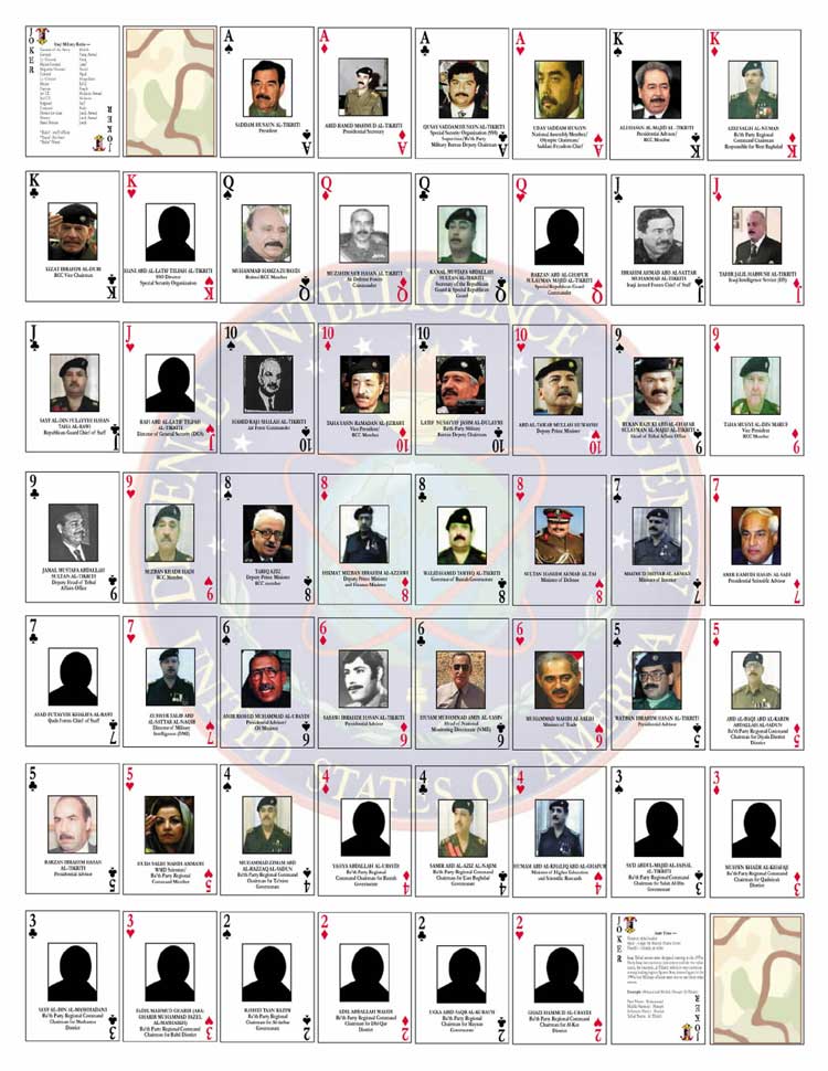 据法新社报道,美国国务院当地时间周五发出了扑克牌形式的伊拉克高官“通缉令”。媒体报道称扑克牌共有55张,其中52人为伊拉克官员名单,另外的3张为伊拉克人姓名等相关问题介绍。这些高官按扑克牌的次序依次列出,其中萨达姆与他的两个儿子分别被定为黑桃、梅花和红心A。方片A为萨达姆私人秘书哈穆德。据悉,扑克牌“通缉令”已经发到美军官兵手中。