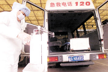市急救中心为了应对非典,调出6部急救专车供运送抢救非典病人,每天14组医护人员24小时轮流值班。图为工作人员为120急救车做紫外线照射消毒。