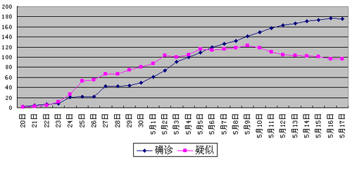 截至5月17日10时,天津市累计确诊非典型肺炎病例176例(其中医护人员67例),治愈出院8例,死亡12例。疑似病例97例(其中医护人员34例),排除疑似病例35例,疑似病例治愈出院11例。