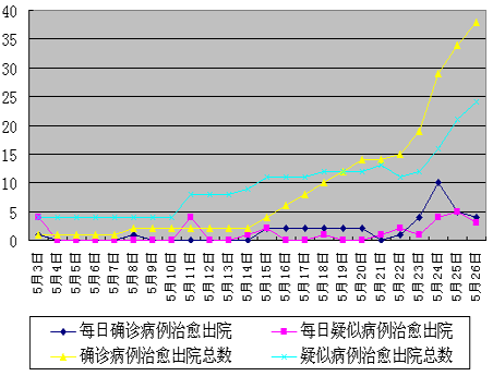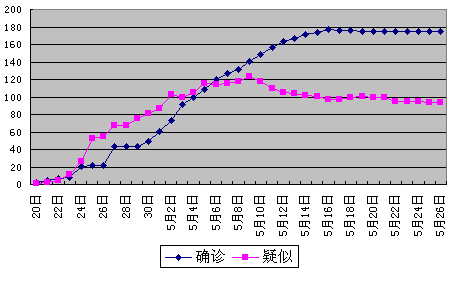 截至5月26日10时,天津市累计确诊非典型肺炎病例175例(其中医护人员67例),治愈出院38例,死亡14例,排除确诊病例1例。疑似病例94例(其中医护人员33例),排除疑似病例43例,疑似病例治愈出院24例。