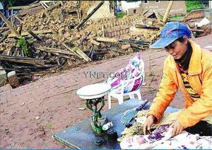 | 图为当地村民在倒塌房屋旁摆摊儿 |