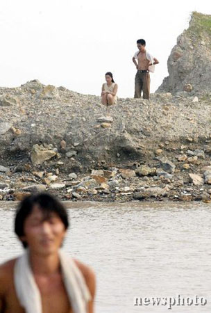 大潮刚过,仍有许多酷暑难捱的游客涉水重新回到刚刚卷走游客的堤坝上