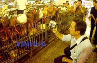 8月15日,世界卫生组织专家组负责人皮埃尔在深圳市东门市场考察时摄录市场现状。由中国科技部、卫生部、世界卫生组织和联合国粮农组织的14名专家组成的SARS科研联合工作组14日抵达广东,在广州、深圳、汕尾等地就SARS冠状病毒动物宿主和病毒传染人类等科研项目的方法和数据展开实地考察。