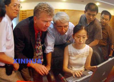 | 8月15日,中外专家在深圳市疾病预防控制中心了解深圳科研人员通过基因分析证明果子狸等动物有SARS病毒的资料 |