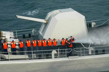 | 在参加演习的船只发生“火灾”后,中国海军521号导弹护卫舰前来协助消防灭火 |