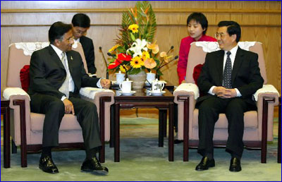 | 11月3日,国家主席胡锦涛在北京人民大会堂与来华进行国事访问的巴基斯坦总统穆沙拉夫举行会谈 |