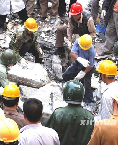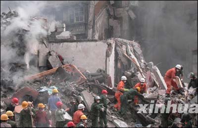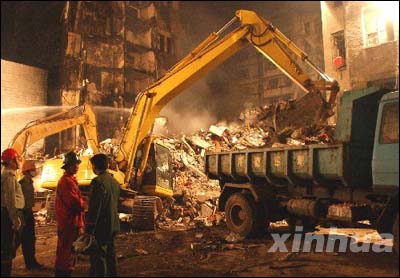 | 11月5日,救援人员在火灾现场抢救被压在废墟中的消防官兵 |