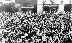 毛主席邀请一起进餐的客人到了,一共接来了三个人,其中有天大校长张国藩和党委书记贾震,有南大的一位领导可能是校长杨石先。这时已经是下午两点钟了,当毛主席刚刚坐下来同两个大学的校长、书记谈话,主要是交谈教育改革问题时,街上的人们沸腾起来了,“毛主席万岁”的口号声、欢呼声响彻云霄。我隔窗望去,烤鸭店门前附近的街上人山人海,一眼看不到边哪!连对面劝业场楼上的窗口上都挤满了人。他老人家站起来,打开纱窗,探出头去,向大家招手致意。