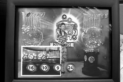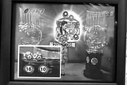 其二,大画面里每个号球从摇奖机里滚下时,会与前面所出的号球之间有一个碰撞,来回滚动,然后再静止,而小画面中的号球滚下时却显得相当的平稳,没有碰撞和来回滚动现象。