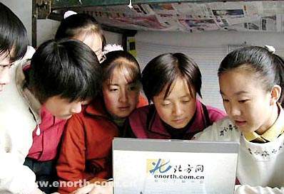 | 张芃扬(右一)在为学生讲解上网知识(北方网资料照片) |
