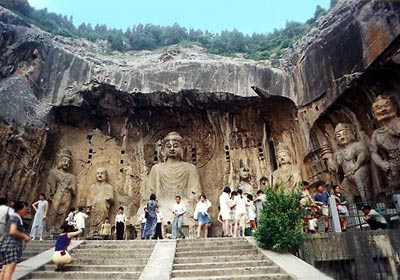 龙门石窟是我国三大石窟之一,位于洛阳城南12公里。这里有一条伊水,河两岸是香山和龙门山。自北魏至晚唐的四百余年间,古代匠师在这两座山上凿窟建寺,使这里成了举世闻名的石雕艺术的宝库。龙门石窟南北长达1公里,共有97000余尊佛像,1300多个石窟。题记和碑刻3600余品。奉先寺是龙门石窟中最大的一个窟,长宽各30米。