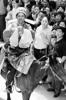 为了能骑马娶媳妇儿,新郎宋健群到骑马场一连练习了一个月,虽然现在骑在马背上动作比较娴熟,但见到这么热闹的场面和鞭炮声,大马仿佛有些害怕了,不是跑快了,就是走得太慢了,这下可让新郎犯了难,只好请马场的人帮忙牵马。