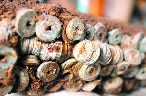 记者赶到现场的时候,塘沽区文化局、塘沽区文保所的工作人员正在现场整理。也许是因为埋在地下的时间太长了,原本被整齐码放成堆的铜钱都粘在了一起,成了钱坨子。每个坨子都是一个四方块,长宽都在20厘米左右,很明显这些铜钱是被串在一起后再码放起来的。工地的工人们对于挖出“古董”的事兴奋不已,不少工人站在附近观看,一些老塘沽人还在猜测这些铜钱的来历。