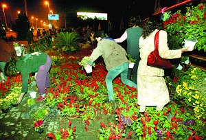 北方网消息:昨天19:00左右,市第二工人文化宫门前广场上的鲜花遭到上百人哄抢。