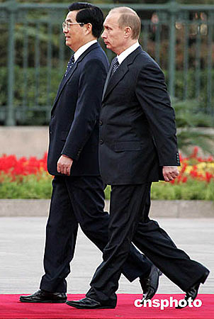 会谈前,胡锦涛在人民大会堂东门外广场举行隆重仪式,欢迎普京访华。
