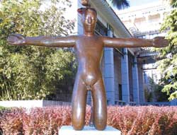 在中国美术馆的院子里,记者看到蔡志松的《故国·颂1》、《故国·颂2》被放置在美术馆正门左侧,人物造型为裸体男性,古人发式,一站一跪,在周围竹林衬托之下,颇有几分神秘色彩。与美术馆院里展出的其他雕塑相较,这两件雕塑很是独特。