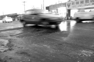 记者在距商学院不远的公共汽车站旁看到,两大片“冰面”横在马路中间,面积足有20多平方米,无形中给汽车行驶埋下隐患。一位等车的学生告诉记者,马路中间的“冰面”非常危险,尤其是公共汽车减速进站时,很容易出现车轮打滑的情况,所以等车的人都必须站得远远的,生怕公共汽车失控撞伤自己。