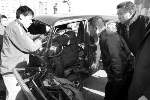 一辆蓝色威姿轿车和一辆紫色大发车侧对着停在路中,大发车面部全部凹陷进去,方向盘也被撞歪,破损的零件和碎玻璃“扔”了一地。相比该辆大发车而言,那辆威姿轿车的“伤情”要轻很多。据目击者介绍,事发在12:45左右,当时,威姿轿车正往外环线方向驶去,但途中不知发生了什么事,车突然向对面车道开去,与大发车相撞。