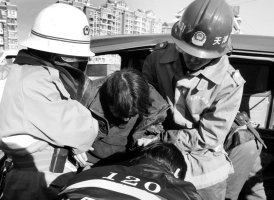 此时,一辆消防车呼啸赶来,几名消防队员从车上搬下一台液压钳子,剪断卡住司机腿的铁皮,这时,司机才能动弹,随后,大家齐手将司机抬到车外,并小心翼翼地放在担架上,整个过程没超过5分钟。