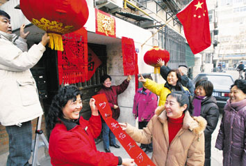 北方网消息:喜迎鸡年新春佳节,河西区敬重里社区昨天呈现出一派浓浓的年味,居委会发动书法爱好者书写春联和福字,购买了雕刻精细的大吊钱,准备了百余盏大红宫灯,分别张贴、悬挂到社区百余个楼栋门前,使小区呈现出喜庆、欢乐、和谐的社区氛围。