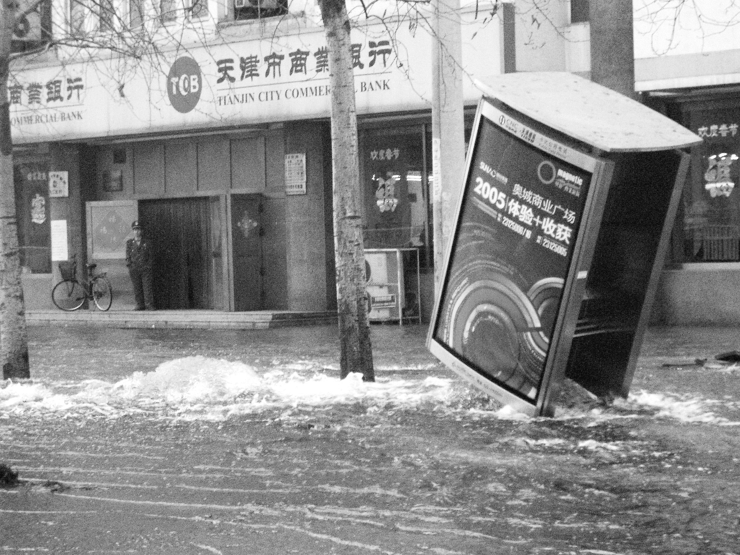 昨天下午4点多钟,本报热线先后接到读者来电,卫津南路的地面不知怎地突然拱起几个大包,刹那间有自来水破地喷涌而出。记者随后赶到现场,看到从李七庄到卫津南路上数百米长的路面成了“泽国”,路面中央被拱破的泉眼随处可见,一些水丘向外快速喷涌着水,流速极快的水甚至将路边的广告牌掀翻。