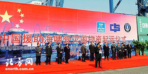 2004年12月印度洋部分国家发生由地震和海啸引发的灾难后,中国政府即宣布提供总额为2163万元人民币的人道主义紧急救灾援助。随着灾情严重性的逐步显现,中国领导人先后对外宣布追加5亿元人民币救灾援助和2000万美元多边捐助。此批货物,是落实5亿元人民币援助的后续部分。在承办这次受灾国物资装运行动中,天津港集团与五洲国际集装箱码头有限公司员工都投入了极大的热情,他们与承运方中海集团,捐赠方中建公司等各方密切协作,从筹备起运仪式到组织装卸生产都精心安排,公司操作部门、市场部以及综合、安监等部门从各个细节入手,密切配合,针对此次工作规模大、任务重的特点,采取了多项措施,以确保救援物资按时、保质地顺利装船。