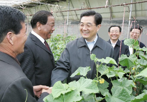 4月7日至8日,中共中央总书记、国家主席、中央军委主席胡锦涛到参加先进性教育活动的联系点山东省寿光市了解情况、调查研究,指导先进性教育活动。这是胡锦涛在山东省寿光市孙家集街道三元朱村蔬菜大棚向菜农了解党员干部在带领群众致富过程中发挥先进性作用的情况。