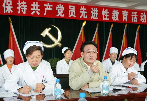 3月19日至20日,中共中央政治局常委、全国人大常委会委员长吴邦国到参加先进性教育活动的联系点宁夏回族自治区中宁县了解情况、调查研究,指导先进性教育活动。这是吴邦国在宁夏中宁县人民医院参加先进性教育活动。