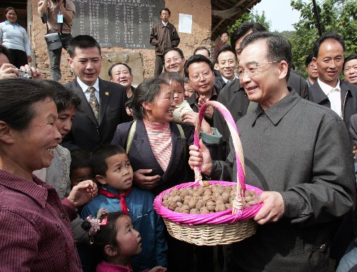 4月23日至24日,中共中央政治局常委、国务院总理温家宝到参加先进性教育活动的联系点四川省通江县了解情况、调查研究,指导先进性教育活动。这是温家宝在四川省通江县毛浴乡浴江村看望村民。