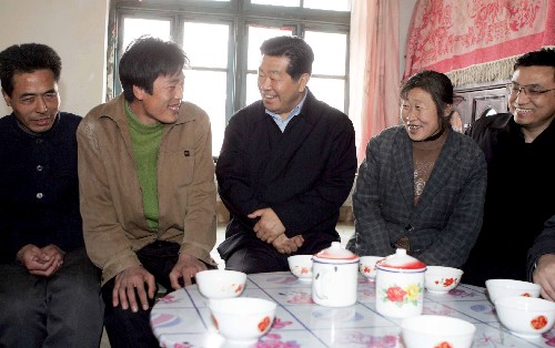 3月21日至22日,中共中央政治局常委、全国政协主席贾庆林到参加先进性教育活动的联系点辽宁省新民市了解情况、调查研究,指导先进性教育活动。这是贾庆林在辽宁省新民市土岗子村看望老共产党员崔全忠(左一)及其家人。