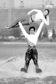 在水上表演入场仪式上,身经百战的表演者在卡通小猪的带领下,徐徐步入表演场内。力量型表演项目“双人技巧”首先登场,两个运动员在水面上依次进行一系列托举、平衡等动作之后,8名滑水运动员在快艇的牵引下出现在水面上演芭蕾。转眼间,4名站在男队员腿上、游走于水面的4名女队员,又将演出内容变为集体双人滑。