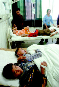 事发后,记者迅速赶到铜梁县人民医院和中医院的病房。数十名孩子躺在床上,手上正打着吊针,医护人员则在忙碌地为小“病号”们诊治,秩序井然有序。