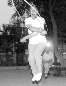 23日20:00左右,记者刚走进睦南花园就听到一阵喝彩声。10多名游人围成的小圈子内,一位老人正手持跳绳,不停地上下跳跃着。快速挥舞着的跳绳在空气中发出“嗡嗡”声。而且老人还编出令人眼花缭乱的各种花样,舞动着的绳索拍击地面时,还会发出清脆响亮的“啪啪”声。