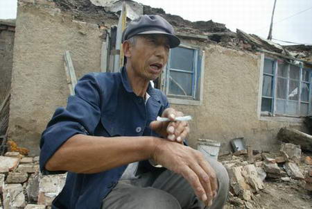 在八屯房屋倒塌最严重的肖连学老人家,记者看到老人正坐在一片残砖碎片屋前犯愁地抽着旱烟,他说:“老伴已送到医院伤情未卜,家中的铁锅都砸坏了,屋里也不敢呆了。”