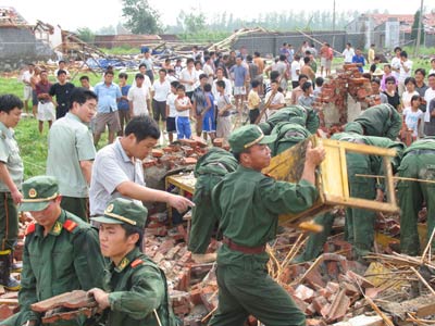11时57分许,灵璧县消防大队接到指令后,迅速出动全部警力赶赴受灾最为严重的韦集镇工业小区。路上,碗口粗的大树被拦腰斩断,横七竖八地倒在路上,车辆无法通行,消防官兵只好一边使用电锯清除路障,一边行车,平时需要15分钟的路当天却走了半个多小时。消防官兵到达现场后立即开展搜救工作,同时找来熟悉小区情况的人了解情况,初步掌握了被埋人员的位置。很快,消防官兵在现场找到6名遇难者,后又从废墟中抬出2具尸体。