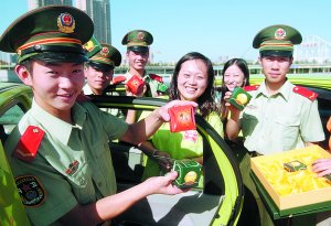昨日下午,“天津QQ族”车友会的13辆QQ轿车拉着享有“南开铁拳”盛誉的24名武警战士们参观游览了银河广场、大沽桥等地。另外,车友会还向这些武警战士赠送了月饼、锦旗等物品,为不能回家团员的武警战士们过了个特殊的中秋节。