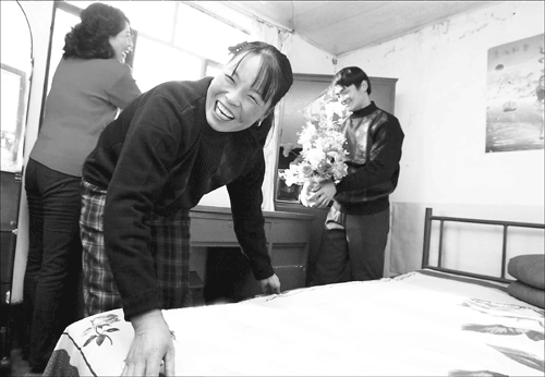 今天上午从市环卫部门获悉,为改善长期担任清扫工作的外来工们的生活环境,天津市在有条件的工地附近建设了一批“夫妻房”,供分居的夫妇临时团聚。据介绍,这种人性化的关怀得益于本市近来相继出台的一系列关爱农民工政策,在“夫妻房”内桌、椅、床、衣、煤气灶具等一应俱全,“夫妻房”使这些准备在天津过年的农民工们今年能过一个“舒心年”了。图为河西环卫局的工作人员正在为即将住进“夫妻房”的农民工夫妇布置“新房”。
