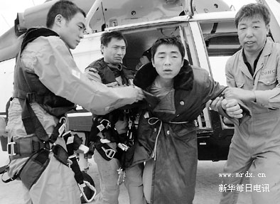 2月17日下午,救助直升机抵达厦门机场,遇险船员在搜救人员帮助下走下直升机。 |