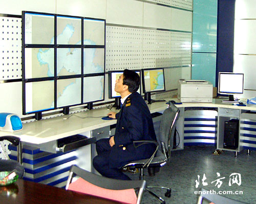 由九个21英寸液晶显示器组成AIS信息显示方阵可清晰显示北方海区全图