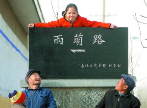 走进村内,向四个方向延伸的柏油马路交汇在村中心地带,交会点旁边竖着一块高约两米的黑色石碑,正面刻着三个醒目的大字“雨萌路”,背面则写着这样一段话:李传学之女李雨萌同学,在得知家乡修路捐款一事后,主动将自己10年的压岁钱1万元拿出来委托爸爸李传学专程从天津送到家乡,为弘扬雨萌同学的奉献精神,特将此路命名为“雨萌路”。下面还写着其他为修路捐款人的姓名和捐款钱数。