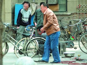 接到举报电话后,记者迅速赶到该处。此时,修车摊前围了4个人,有的站在那里聊天,有的正在修车。读者质疑的私下收售自行车人员,身着黄夹克,短平头,40多岁。